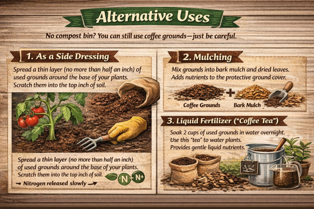 Spread a thin layer (no more than half an inch) of used grounds around the base of your plants. Scratch them into the top inch of soil. This allows them to break down slowly and release nitrogen directly to the roots.
